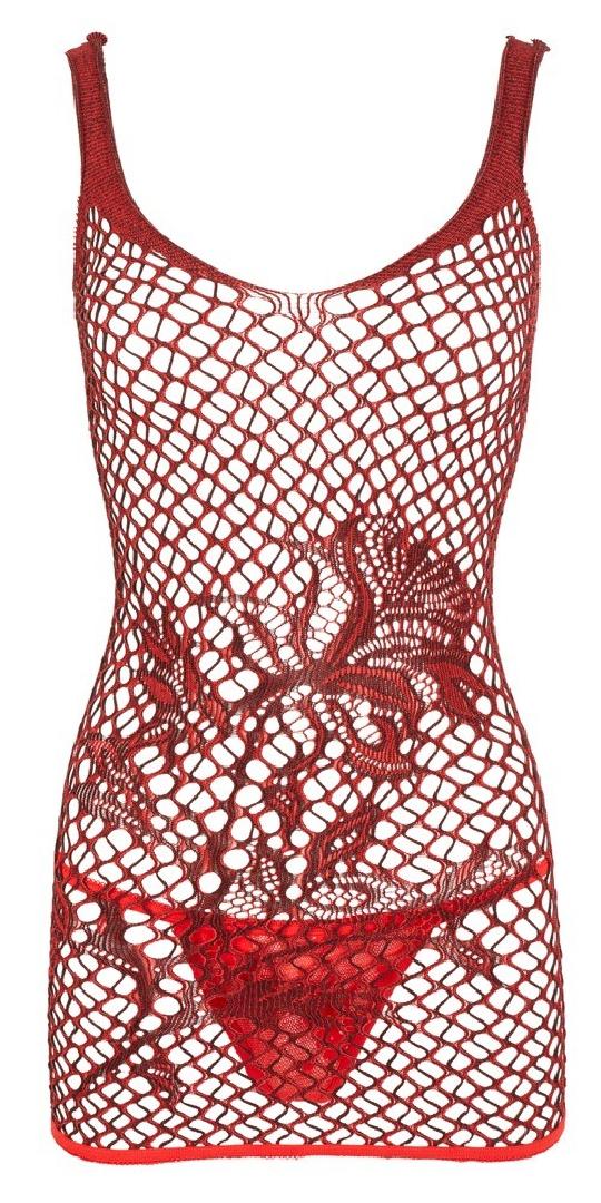 Sexy Abitino rosso a rete in pizzo. Elegante la finitura floreale davanti. Sul retro presenta un' ampia apertura al centro della schiena. Elasticizzato alla perfezione per essere indossato davvero con aderenza e comodità .