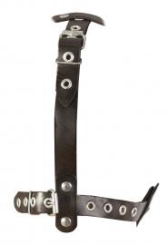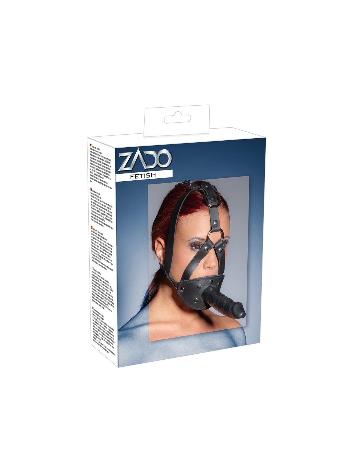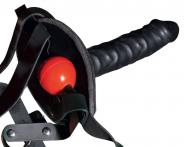 Sull'imbracatura regolabile nera c'è un bavaglio rosso (Ø 3,5 cm) all'interno e un magnifico dildo (13 cm di lunghezza, Ø 3,5 cm) all'esterno. Materiale: pelle crosta (pelle bovina), TPE, lattice.