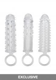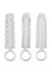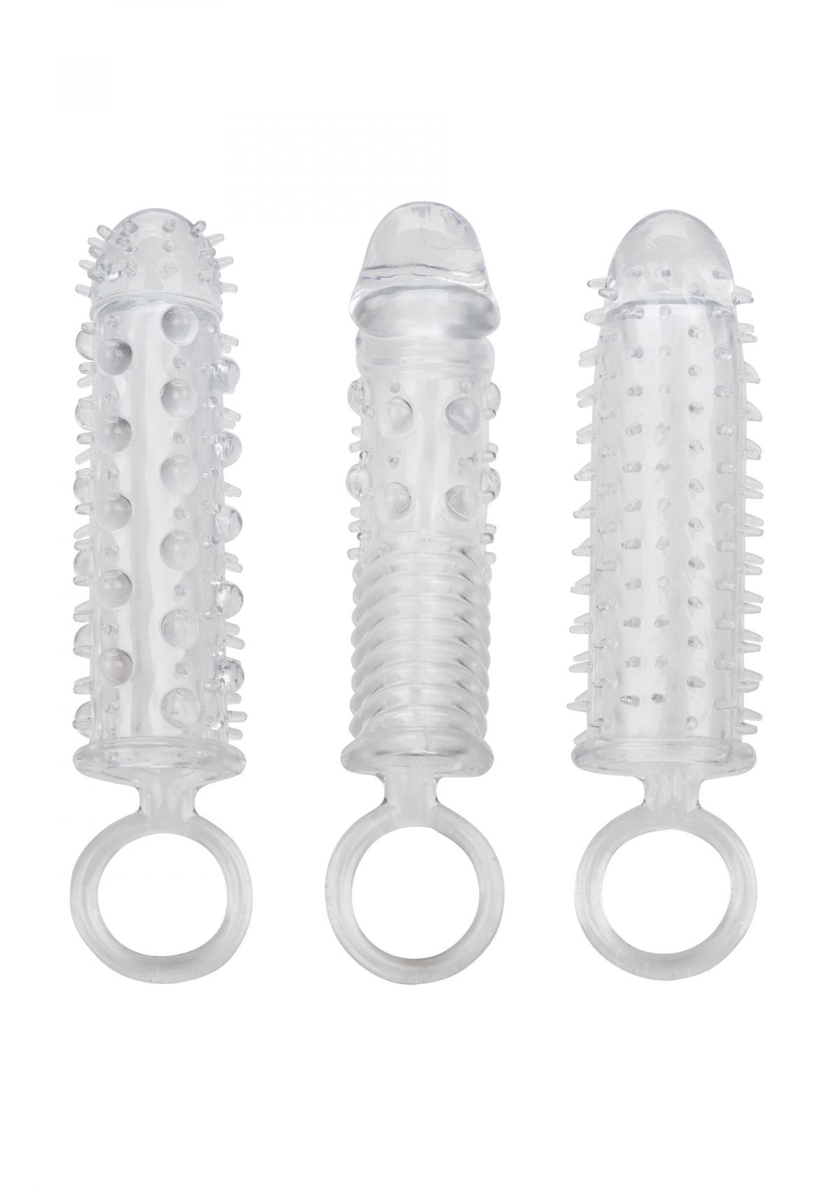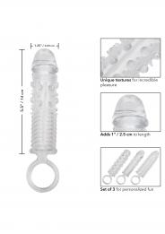 Il kit di estensione in 3 pezzi è un set di 3 guaine di estensione strette e ravvicinate con una struttura a coste all'interno e all'esterno per una stimolazione intensa. Queste guaine per l'ingrandimento del pene si avvolgono strettamente per aumentare la circonferenza, la lunghezza e il piacere esplosivo per tutti i partecipanti. L'enhancer erotico è dotato di una solida testa del pene accentuata e di una punta del serbatoio che offre un piacere extra di 1". Mentre voi eccitate il vostro amante con una maggiore circonferenza e stimolanti solleticatori, il potente supporto all'erezione e la camera testurizzata dello stimolatore erotico garantiscono risultati esplosivi per entrambi. La camera testurizzata e l'anello di sostegno forniscono una maggiore stimolazione e un potente supporto. Avvolgete il vostro strumento di piacere in questa guaina super elastica per aumentare facilmente la resistenza, la stimolazione e il piacere dell'orgasmo. L'enhancer flessibile è realizzato in TPE igienicamente superiore. Questo materiale sicuro per il corpo non è profumato e non contiene ftalati, per rendere felici e sani i vostri punti più sensibili.