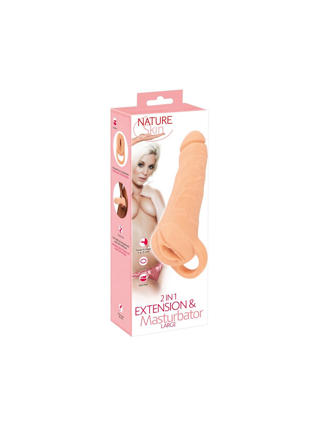 Il 2in1 Extension + Masturbator LARGE di Nature Skin combina una guaina per il pene per l'allungamento e l'ispessimento con un masturbatore in un unico giocattolo. Il design è incredibilmente realistico all'esterno, con un'apertura in stile vagina e una guaina venata in stile pene con glande rigonfio. L'interno ha un'intensa e autentica texture stimolante per un perfetto massaggio del pene durante le seghe e il divertimento a due. L'anello per testicoli, molto elastico, offre un'eccitante trazione durante la masturbazione e una presa sicura durante il sesso.