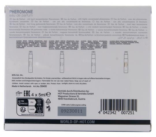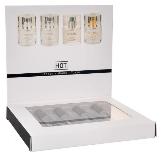 Il Pheromone Perfume Tester Box LMTD da donna di HOT presenta 4 fragranze urbane selezionate in un set che vi immerge nello spirito delle città di Londra, Miami, Tokyo e Dubai. Ciascuna delle fragranze è arricchita con feromoni per sottolineare e accentuare l'attrattiva femminile. Per un'aura irresistibilmente attraente!