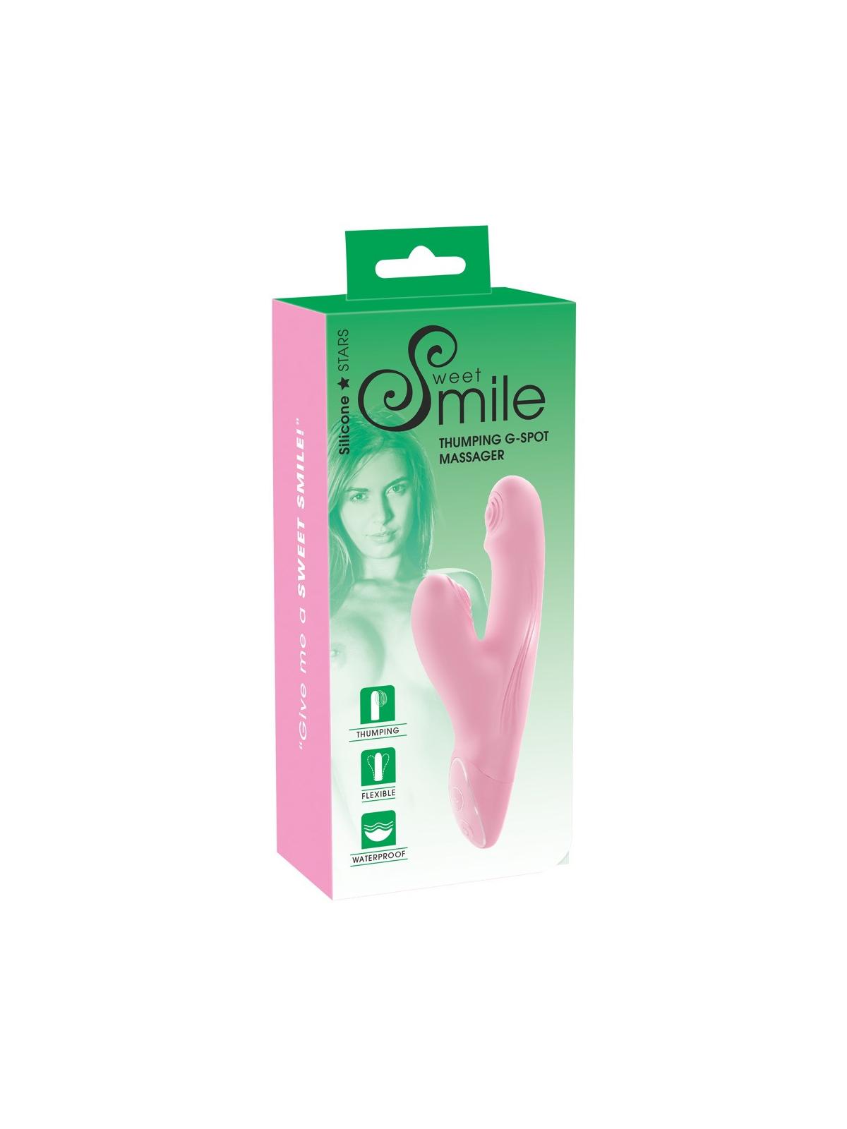 Massaggiatore flessibile Thumbing G-Spot di Sweet Smile con innovativa funzione di picchiettamento nella punta idealmente curva del punto G e stimolatore clitorideo. Entrambi dotati di una struttura di stimolazione morbida. 2 motori forniscono 8 modalità di battitura pulsante che possono essere comodamente controllate direttamente sul giocattolo con il tocco di un pulsante. Ricoperto dappertutto con una struttura morbida al tatto, il Thumbing G-Spot Massager fornisce una sensazione molto piacevole sulla pelle durante la stimolazione. Poiché è impermeabile, puoi giocarci anche sotto la doccia o nella vasca da bagno.
